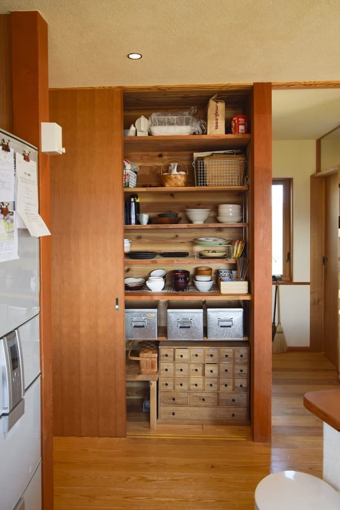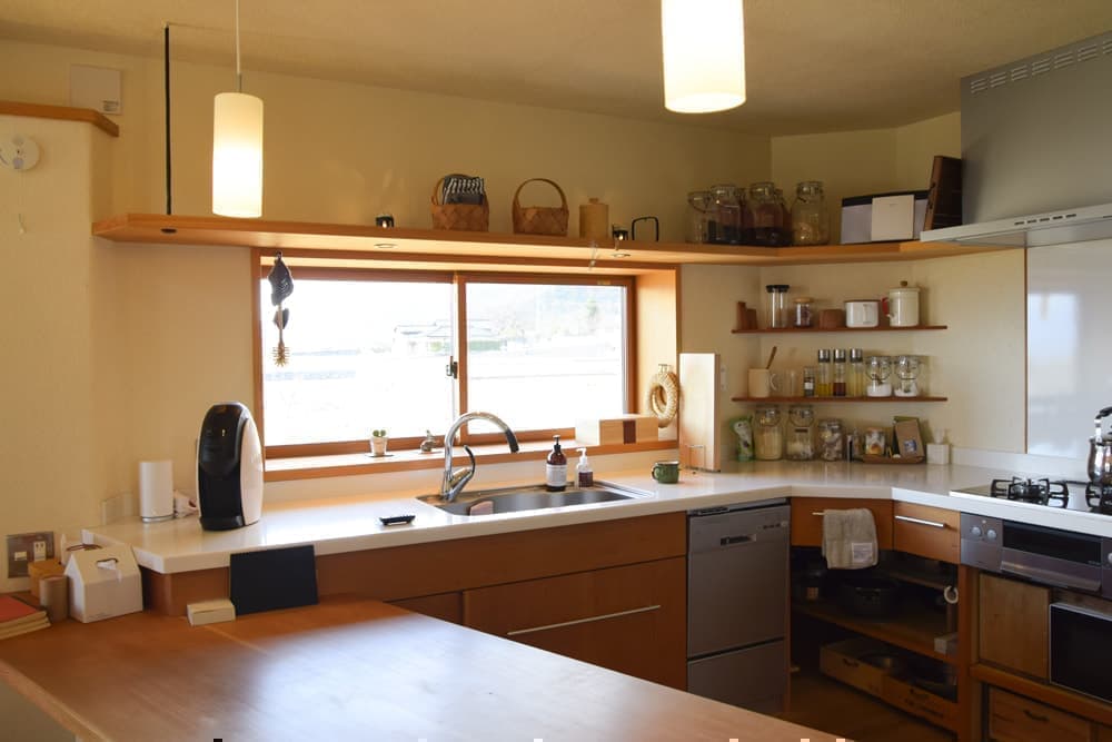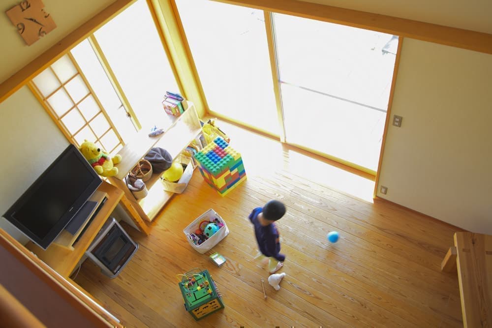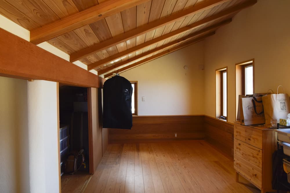 部屋を全面的に区切るドアの数を最小限に抑え、家族のつながりを感じられる住空間に。それでいて”だだっ広い”のではなく、斜めに造り付けられたダイニングテーブルと大黒柱の間隔や、壁の張り出し具合にこだわることで、それぞれのスペースが独立している感覚も創り出している。キッチンは奥様のお気に入り、2階の小部屋は子どもたちみんなが大好きな場所だ。