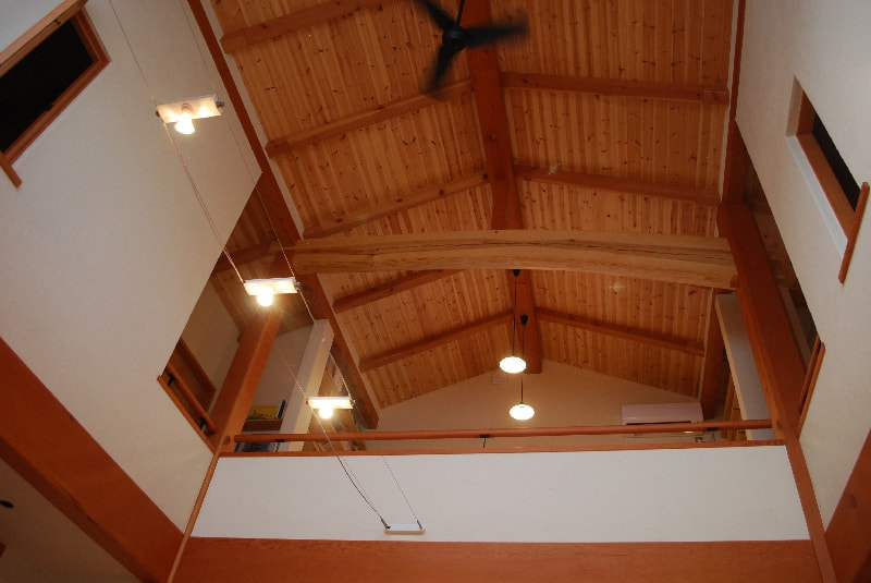 リビングの無垢板の床に寝転がって、無垢の木を見せた高い天井と、曲がりが美しい