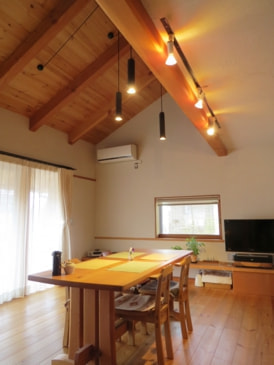 夫婦が人目を気にせずにゆっくりできるよう、あえてキッチンとリビング、和室を2階に配置。無垢の木と漆喰を用いることで、落ち着きを感じる空間となっている。