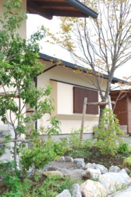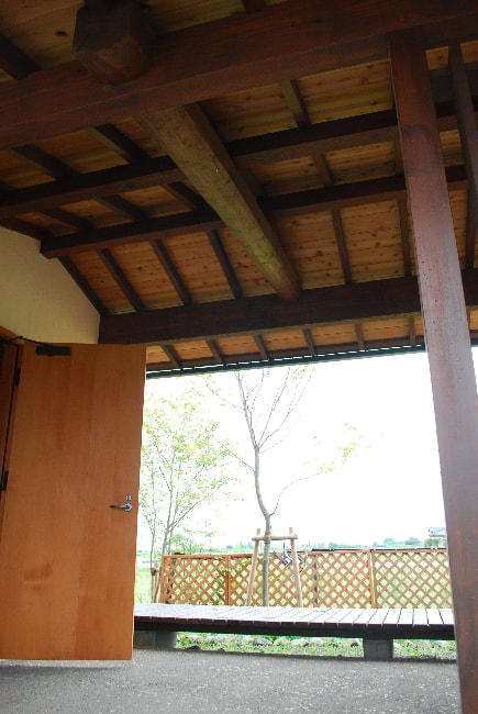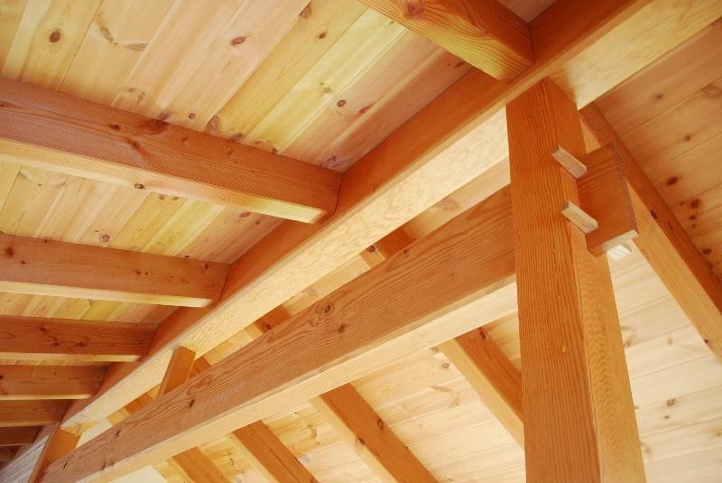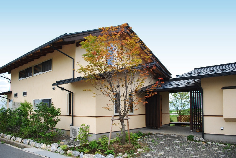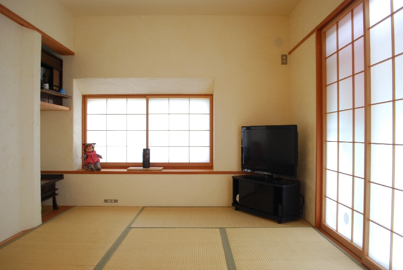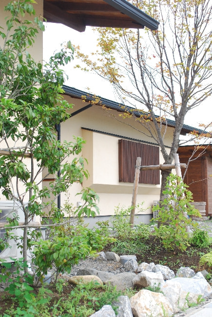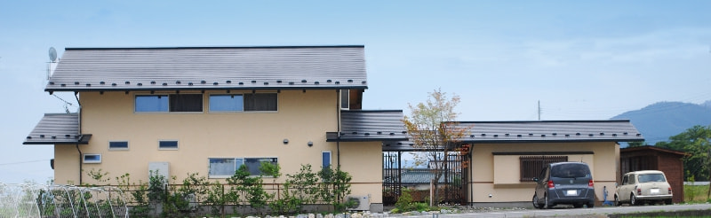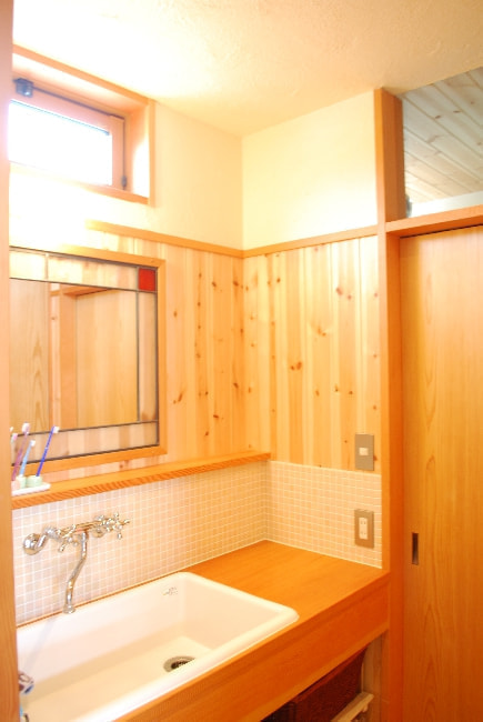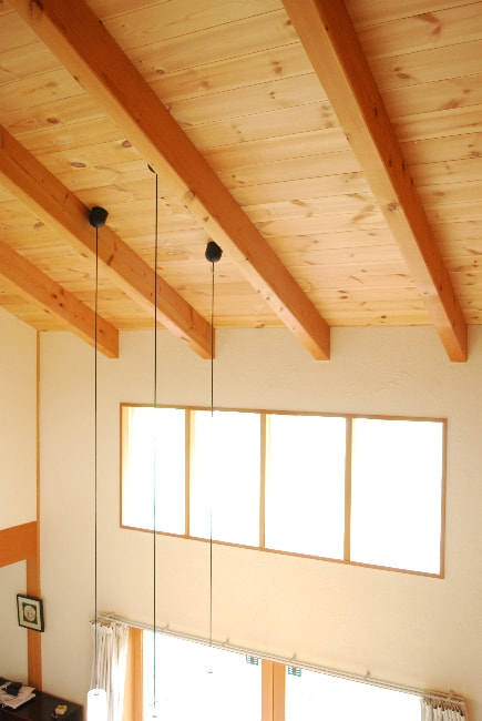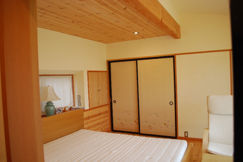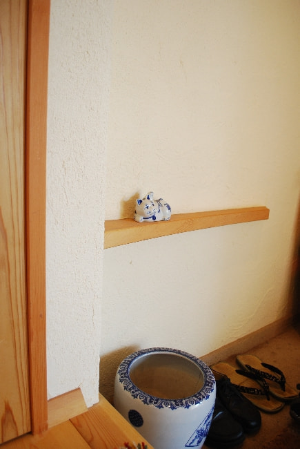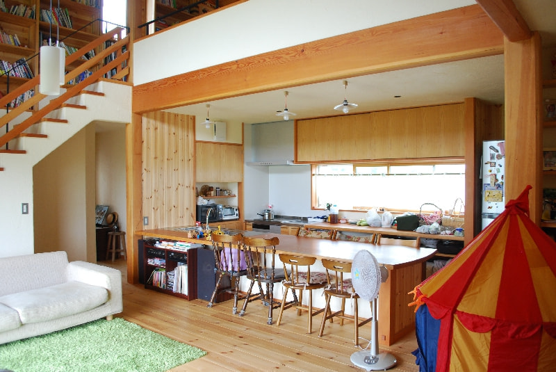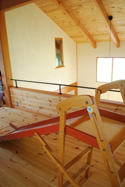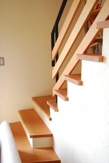 アイアンのシンプルな手すりつきの階段には、木製の板を並べて開放感を残しながら転落防止に配慮。階段に腰掛けて本も読める。無垢の木の木組みが見え、しっくいで仕上げたやさしい雰囲気の自然素材の家で、よく眠れるようになったという。