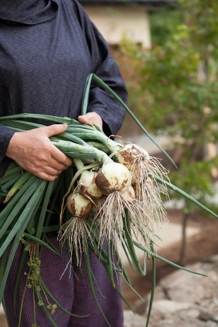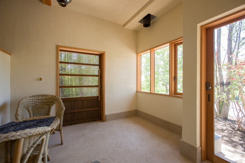 無垢の木と漆喰による丁寧な仕上げで、室内にいても外のような居心地の良さ。土間の玄関には古い蔵戸を使用。畑いじりが大好きなご夫婦のために土間の作業スペースも設けている。