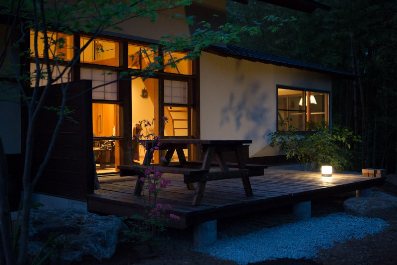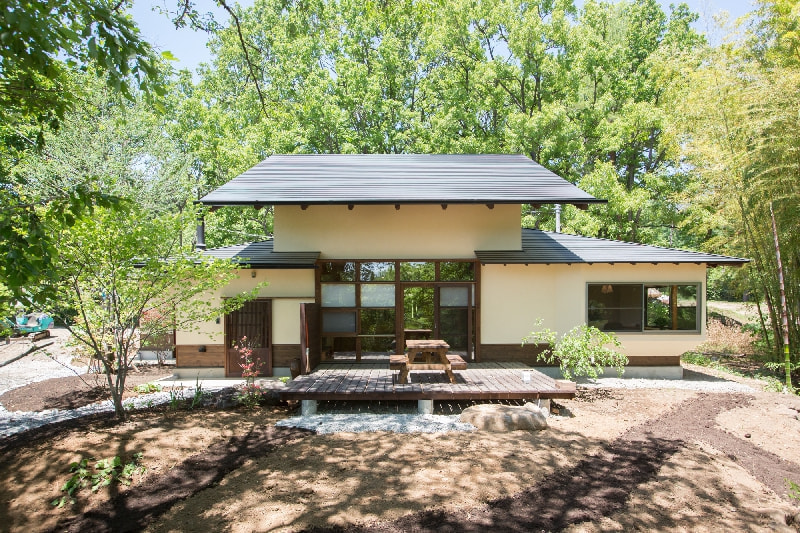 竹藪や小川、様々な背の高い広葉樹や山野草に囲まれた、豊かな自然環境に馴染む住まい。家の中央に配した猫間障子や、青々とした竹を枠取るダイニングの窓、テラスを大きく取り、四季折々の景色を存分に楽しめるように。さらに、この家と自然に合うように、”まるで山から採ってきたような”おおらかな枝ぶりの庭木を選んで植え、庭づくりが進行中。