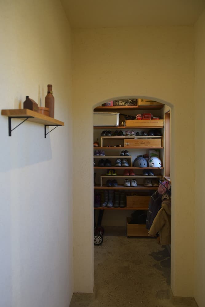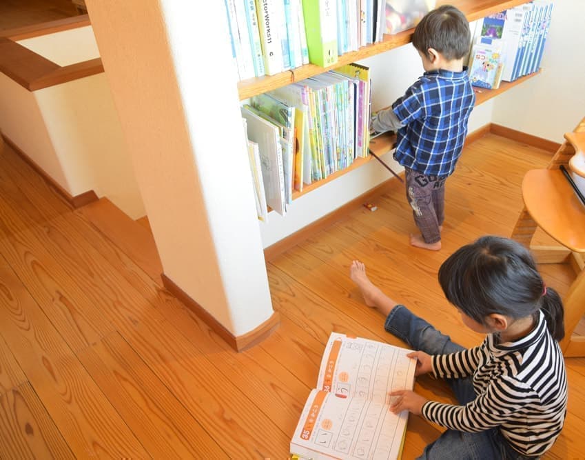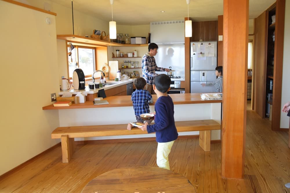 部屋を全面的に区切るドアの数を最小限に抑え、家族のつながりを感じられる住空間に。それでいて”だだっ広い”のではなく、斜めに造り付けられたダイニングテーブルと大黒柱の間隔や、壁の張り出し具合にこだわることで、それぞれのスペースが独立している感覚も創り出している。キッチンは奥様のお気に入り、2階の小部屋は子どもたちみんなが大好きな場所だ。