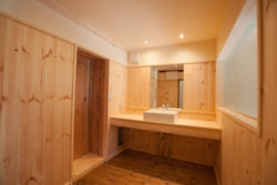 ▲大移動したキッチンには棚も取りつけ使いやすく。洗面脇には光がふんだんに入るこだわりの風呂が。古い板戸を効果的に配置。
